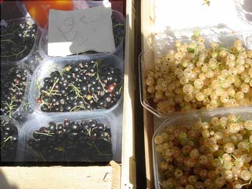 Black currants, red gooseberries and loganberries, which I’ve never found in France. The vendor told me they were framboises américain (American raspberries).